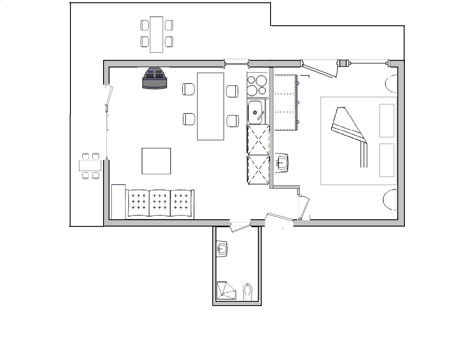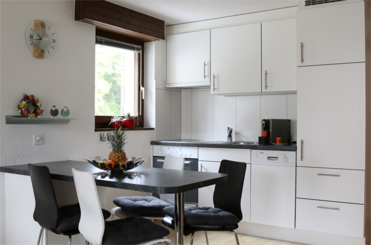 Vollausgestattete Küche mit Essplatz, 1 Doppelschlafzimmer mit Waschbecken und Balkon Richtung Westen Dusche/ WC